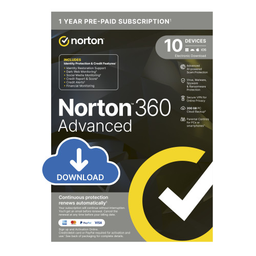 Norton 360 Advanced (No Insurance) - 200GB, 1 User, 10 Devices, 1-Year, Includes VPN & AntiScam, Enrollment Digital Key