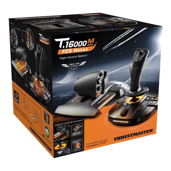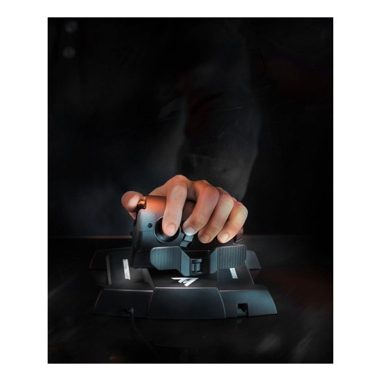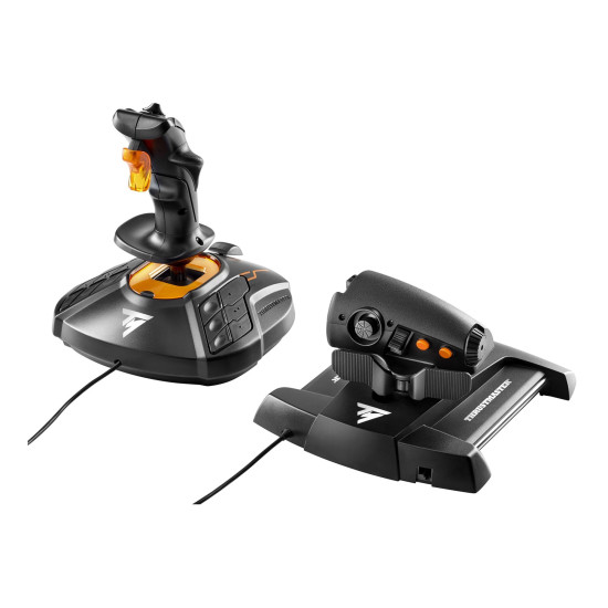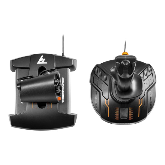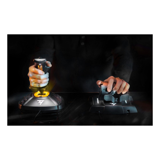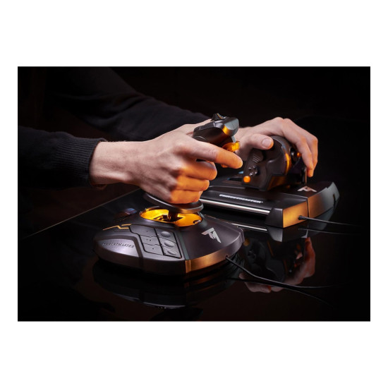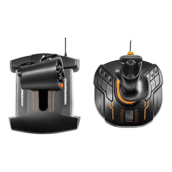 Striking orange accents and backlighting enhance the visual appeal of the HOTAS system.