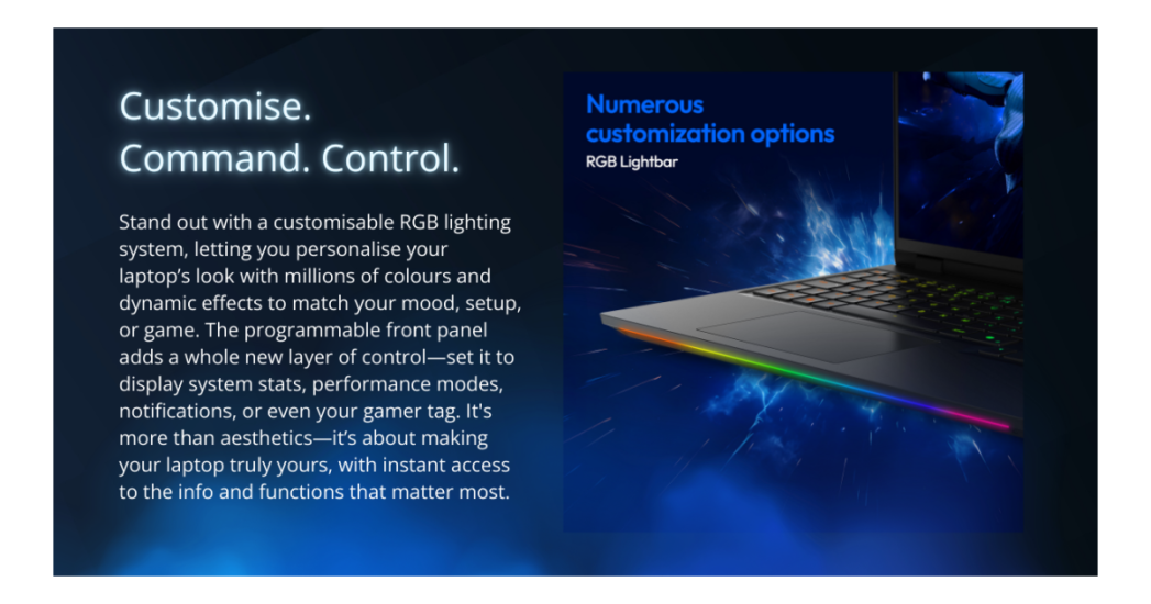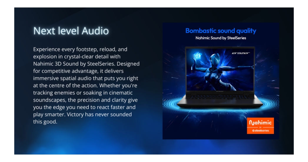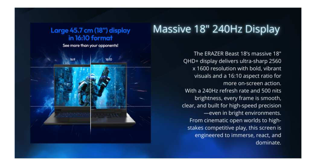 The 18" QHD+ 2560x1600 screen with a 240Hz refresh rate ensures smooth gameplay with zero motion blur. The immersive screen enhances productivity, while Nahimic sound technology deliver cinematic surround sound for an immersive gaming and entertainment experience.