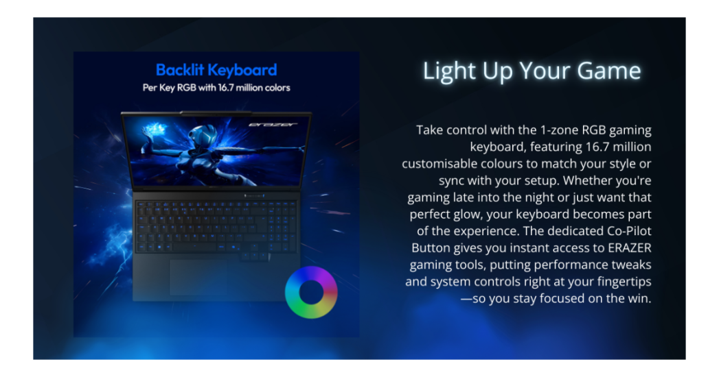 240Hz refresh rate, RTX 5090 graphics, and AI-powered features ensure ultra-smooth, lag-free gameplay with precise control using the RGB mechanical keyboard.