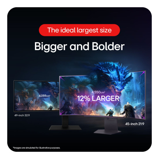 The 45-inch Ultra-WQHD OLED panel delivers stunning visuals with extraordinary clarity and detail. The HDR True Black 400 certification ensures deep blacks, vibrant colours, and high contrast ratios, bringing every scene to life.