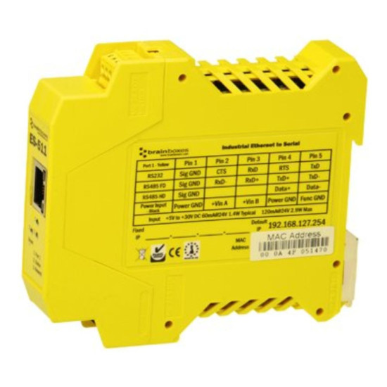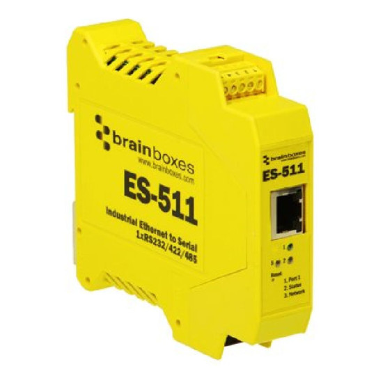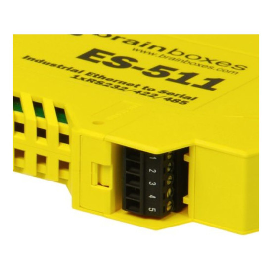 Ethernet to Serial Device with 1 Port software selectable as RS232, RS422/485 Full duplex or RS422 Half duplex. ES-511 has removable Screw Terminals Blocks for easy wiring, a slim 'end on' case and integral DIN rail mount. Our Industrial Ethernet to Serial has an operating temperature range of -30 to +80 degrees Celsius and with +5VDC to +30VDC Dual input reverse polarity protected power supply making it perfect for industrial applications. Data transfer rates up to 1,000,000 baud, coupled with 1Mbit/s line drivers deliver uncompromising performance. Our Industrial ES range provides simple instant networked serial ports in demanding environments. Serial Port Tunneling allows serial cable replacement over any distance, no software required. Suitable to be wired into existing power and network infrastructure or can be used with our PW-600 power supply.