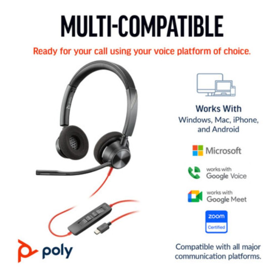 The Blackwire 3300 Series is completely plug-n-play with USB devices, so users can take calls in the office or on the go. Its robust design delivers reliability you can count on. This is the hassle-free headset you've been looking for.Look good, feel good, sound amazing