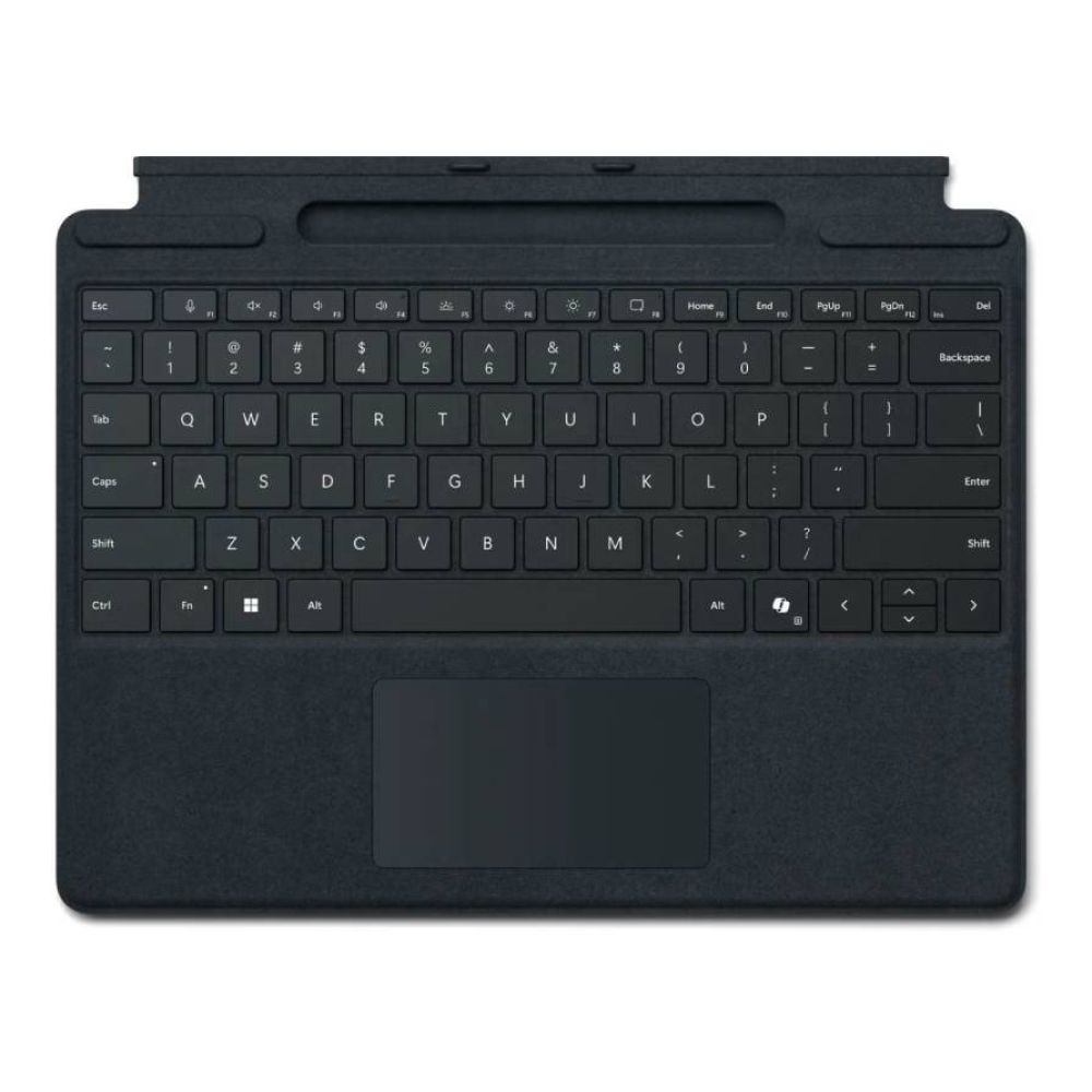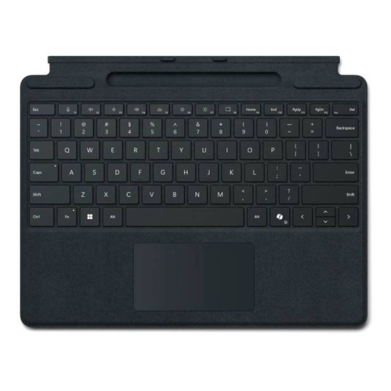 Designed with elegant black colored Alcantara fabric, the Microsoft Surface Pro Keyboard for Business with Pen Storage attaches magnetically to your Surface Pro 10 for Business to provide a smooth and comfortable laptop-like typing experience. This mechanical keyboard cover device also enhances your productivity with a dedicated Microsoft Copilot key, integrated shortcut keys, and a built-in glass touchpad. A convenient storage tray keeps your separately purchased Surface Slim Pen for Business nearby while providing easy recharging.