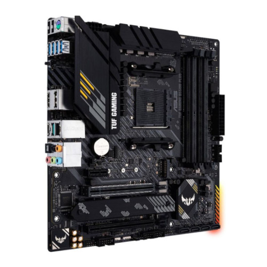 TUF Gaming B550M-Plus provides a complete, high-performance gaming package with a long list of features to improve your experience, including ultrafast networking for smoother online gameplay, pristine audio with positional cues for FPS gaming, and onboard RGB lighting that syncs with attached accessories to help you create a personalized gaming atmosphere.