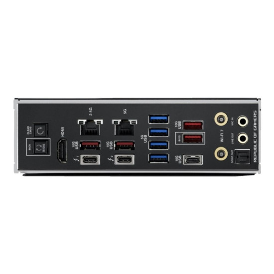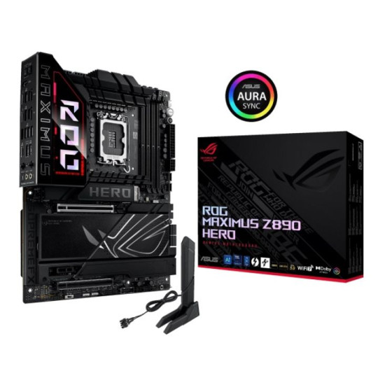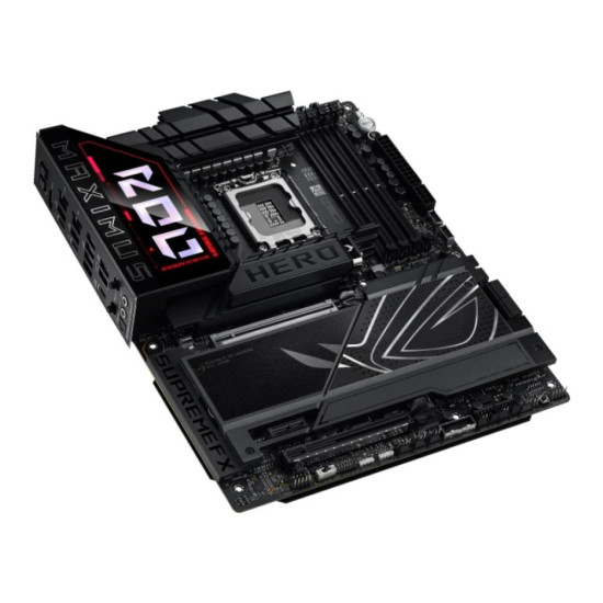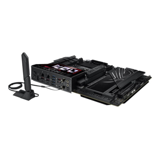Intel Z890 LGA 1851 ATX motherboard, Advanced AI PC-ready, 22+1+2+2 power stages, NPU Boost, DDR5 slots with NitroPath DRAM Technology, DIMM Flex, AEMP III, WiFi 7 with ASUS WiFi Q-Antenna, three PCIe 5.0 M.2 slots and three PCIe 4.0 M.2 slots onboard with ROG M.2 PowerBoost, SlimSAS connector, PCIe 5.0 x16 SafeSlot with PCIe Slot Q-Release Slim and full support for next-gen graphics cards, two Thunderbolt™ 4 ports, USB 20Gbps Type-C front-panel connector with Quick Charge 4+ up to 60W and USB Wattage Watcher, ASUS AI Advisor, AI Overclocking, AI Cooling II, AI Networking II and Polymo Lighting II