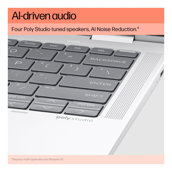 The 14" WUXGA touchscreen features 400 nits of brightness, 100% sRGB colour accuracy, and Corning Gorilla Glass 7 for durability. Audio by Poly Studio with quad speakers and dual microphones ensures crystal-clear sound during calls and media playback.