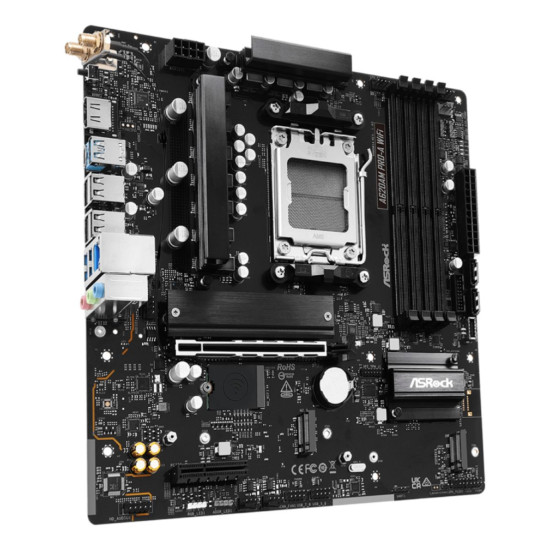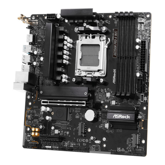 The ASRock A620AM Pro-A WiFi is a Micro-ATX motherboard built for AMDs latest AM5 processors, supporting Ryzen 7000, 8000, and even 9000 series CPUs. It uses the AMD A620A chipset and delivers a strong balance of performance and value, making it a reliable choice for gaming and productivity builds. Equipped with 4 DDR5 DIMM slots, it supports up to 256 GB of memory with EXPO/XMP profiles for speeds exceeding 8000 MT/s (OC). For storage, it provides two PCIe Gen4 M.2 slots, one PCIe Gen3 M.2, and two SATA3 ports, ensuring plenty of flexibility for fast NVMe SSDs or traditional drives. Expansion is handled by a PCIe 4.0 x16 slot for GPUs and a PCIe 3.0 x4 slot, while onboard HDMI 2.1 output supports up to 4K @ 120 Hz when paired with a compatible Ryzen APU.