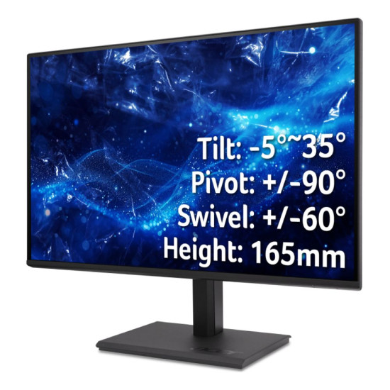 With height adjustment, a tilt angle range of -5 to +35 degrees, and a swivel angle of 120 degrees, this monitor can be positioned for optimal comfort and user preference.