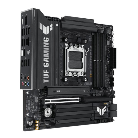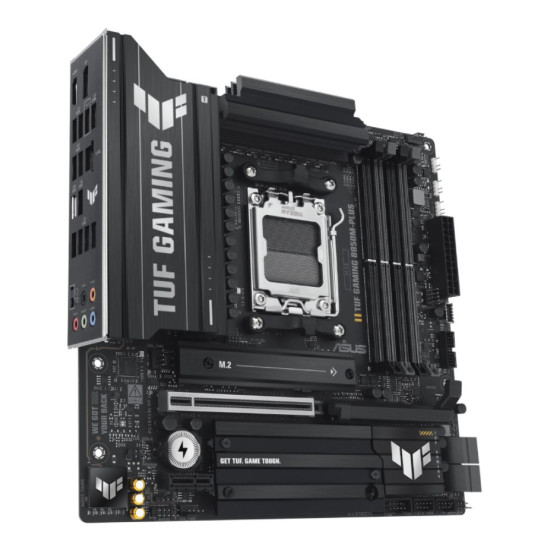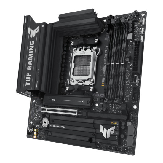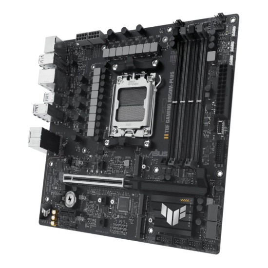 Get TUF. Game TUF.The ASUS TUF GAMING B850M-PLUS motherboard combines cutting-edge AMD Ryzen™ technology with gaming-optimised features and exceptional durability. Built with military-grade components, enhanced power delivery, and advanced cooling, it offers unparalleled stability for extended gaming sessions. Rigorous endurance testing ensures reliability under extreme conditions. This robust platform provides the necessary power and connectivity for demanding AI applications, making it an ideal choice for gamers and enthusiasts seeking top-tier performance and longevity.
