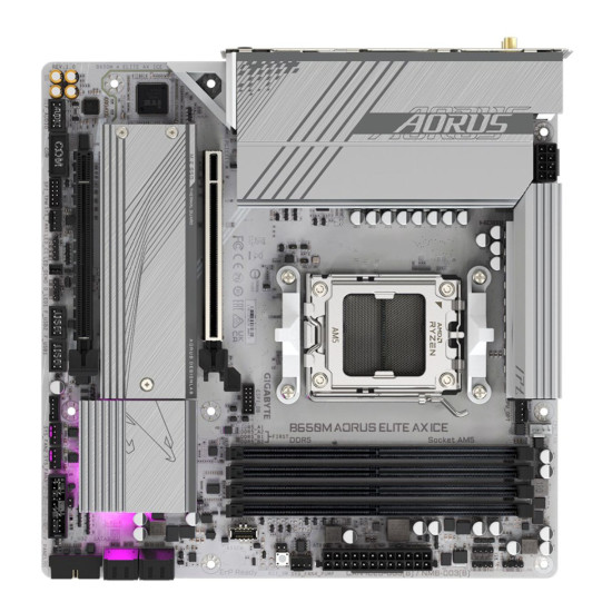 Designed for gaming enthusiasts looking for robust utility and unique style, the Gigabyte B650M AORUS ELITE AX ICE AM5 Micro-ATX Motherboard enables seasoned builders to leverage the power of AMD's Ryzen processors and gaming-focused components for greater system-wide performance while sporting an ice cool motif.