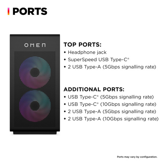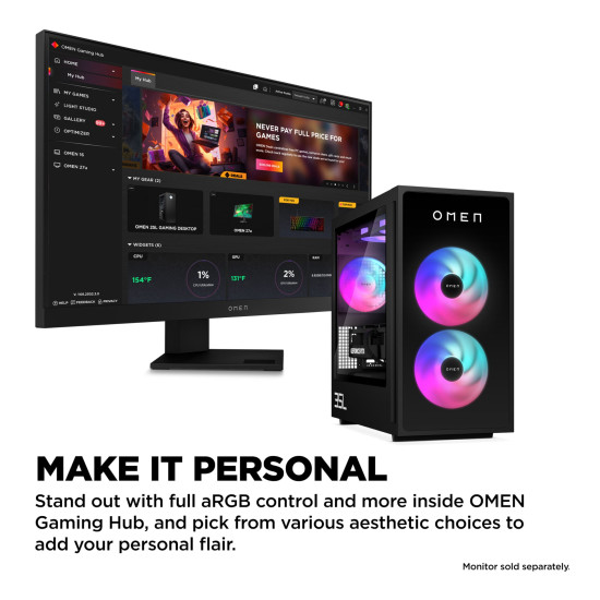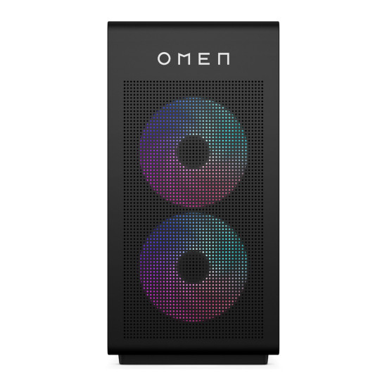 Matte black tower design with tempered glass panel and OMEN RGB logo. Spacious enough for upgrades without taking over your desk.