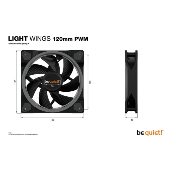 A highly optimized fan frame and impeller achieve the silent operation be quiet! is famous for. With a noise level of just 31dB(A) at maximum fan speed, it proves that instead of being a replacement the lighting is an addon to silent and very powerful operation. All features combine to make Light Wings 120mm PWM high-speed the fan of choice for silent show cases and gaming systems alike.