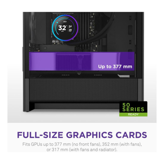 Full-Size GPU Support: Fits graphics cards up to 377 mm (without front fans), 352 mm (with front fans), or 317 mm (with front radiator and fans installed).