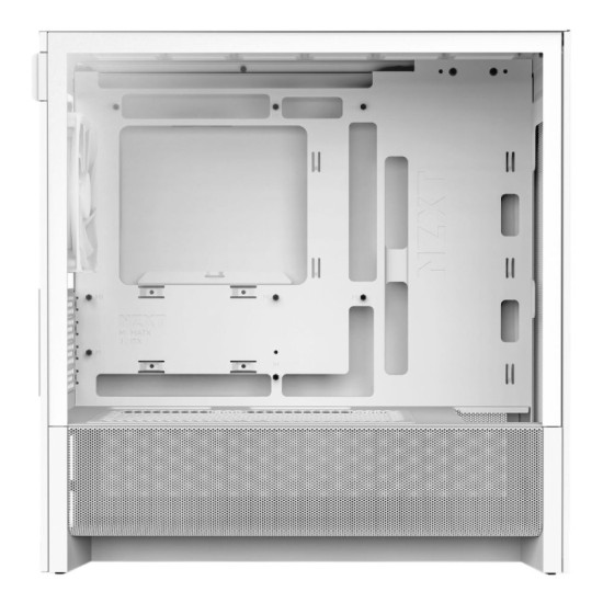 A white, empty NZXT computer case with cutouts for components, cable management holes, and mounting brackets visible inside. The interior is clean, minimal, and ready for PC assembly.
