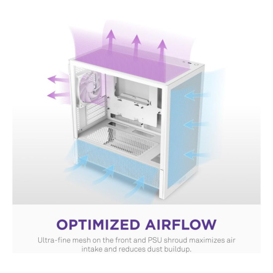 High-Airflow Design: Ultra-fine steel mesh panels and a ventilated PSU shroud maximize airflow while effectively filtering out dust.