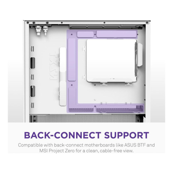 A white computer case interior with various motherboard connectors and slots highlighted in purple, including power, data, and fan headers. The NZXT logo is visible on the left panel.
