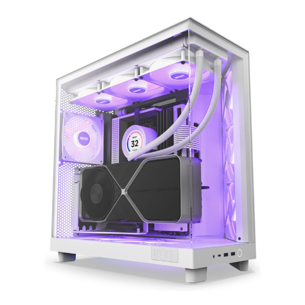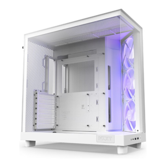 Experience performance with a fresh perspective. The H6 Flow's innovative compact design emphasizes GPU cooling with a strategically angled front corner, so the fans direct air where it's most needed. The panoramic glass proudly showcases the interior, while the dual-chamber layout frees up space for a cleaner look and better cooling performance