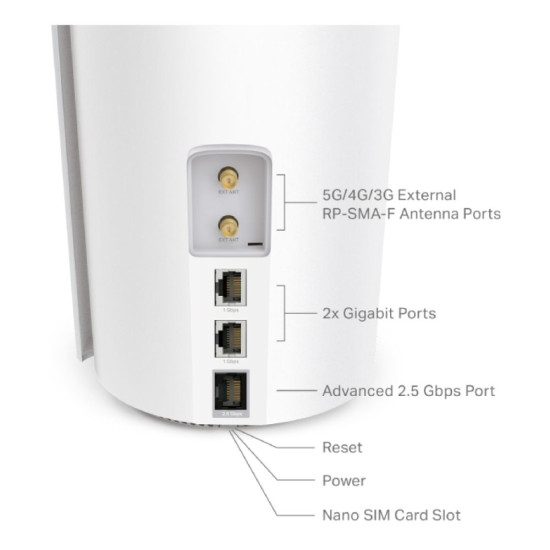 Better Signal for Connections Everywhere With advanced 2.5 Gigabit port, Deco X50-5G provides reliable, warp-speed connections for high-intensive wired devices. When its set as a wireless router, both Ethernet ports support being used as backup broadband access points. Furthermore, two external antenna ports allow external antenna access which can receive 5G/4G signals more effectively, resulting in improved 5G/4G performance.