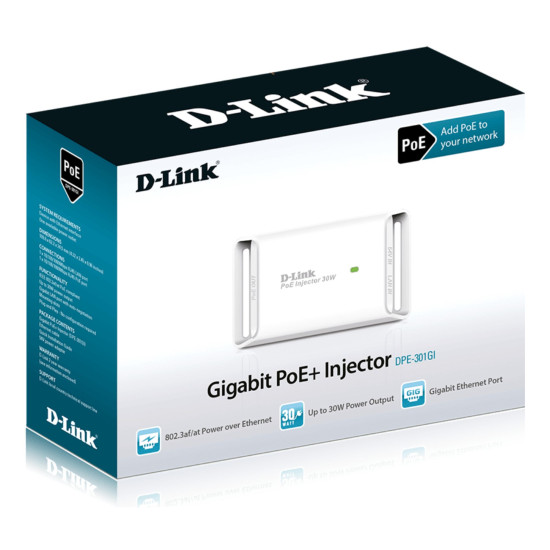 The DPE-301GI, offers a ready-to-use PoE solution by offering up to 30 watts of output power. It is compliant with the IEEE 802.3at/af standard, and is designed to be deployed in situations where high bandwidth is demanded. Adding more power-hungry PoE devices or access points is now easier than ever.