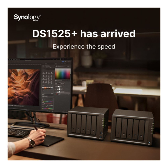With an AMD Ryzen V1500B quad-core CPU and 8GB ECC memory (expandable to 32GB), the DS1525+ handles intensive workloads, including large backups, media editing, and database hosting.