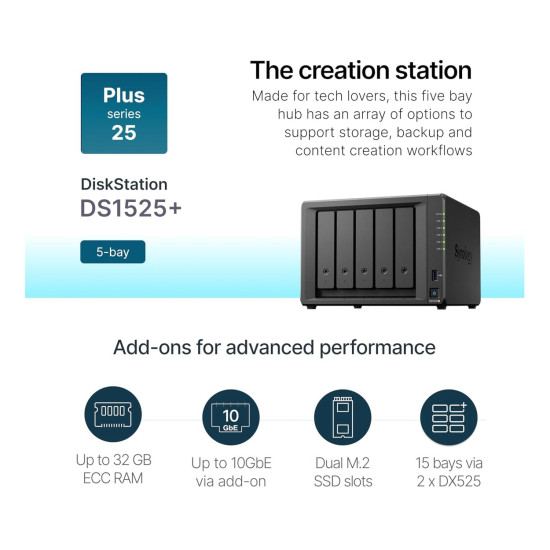 Need more space later? Add up to 10 additional drives via expansion bays. The DS1525+ supports up to 300TB raw capacity, ensuring it grows alongside your business.