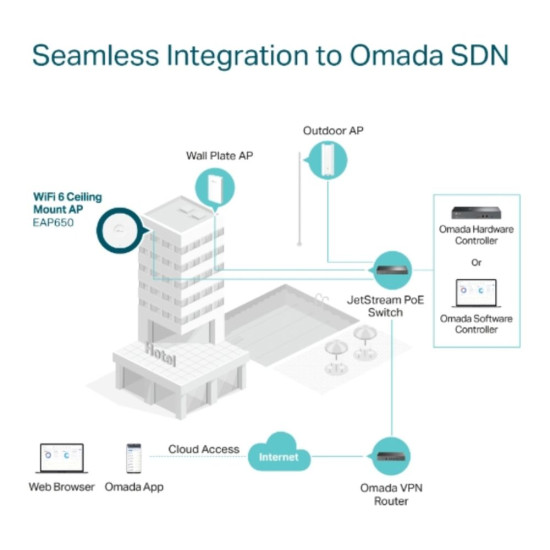 Exceptional performance with compact design ensures simple WiFi installation while saving space. The elegant appearance makes EAP650 perfectly blend into any modern office, hotel, classroom, or café.