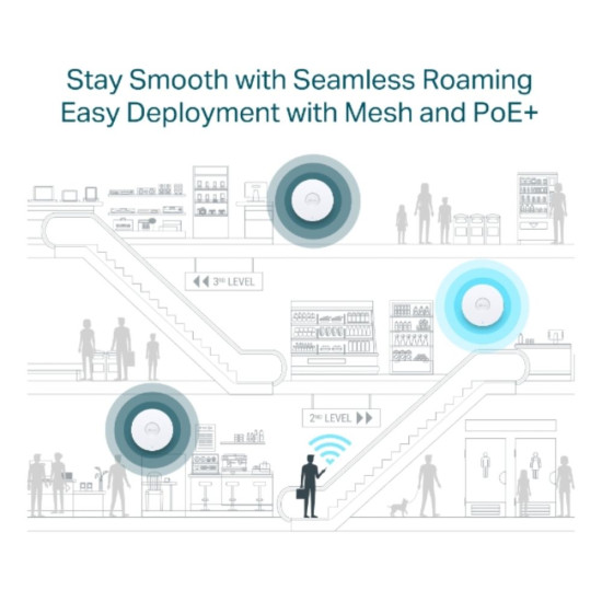 With Mesh technology, Omada EAPs save you from extra wires by wirelessly extending your WiFi signal further and more flexibly to hard-to-wire areas.