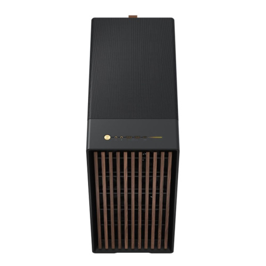 walnut front, a faux leather tab and sleek steel or brass details