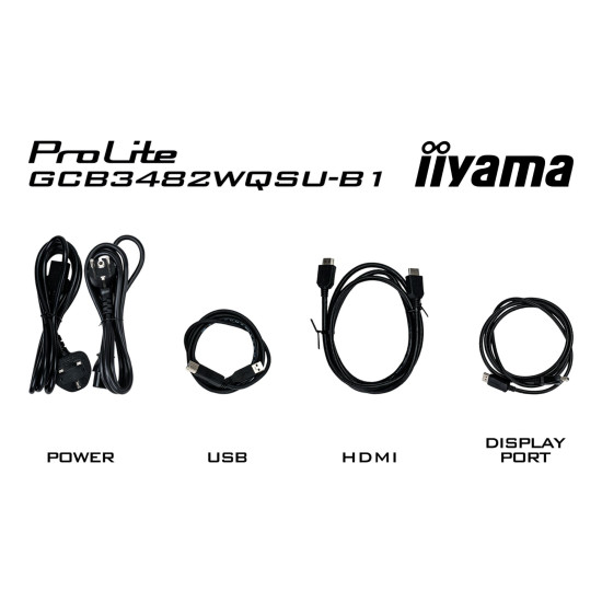 The monitor comes with several cables: a 1.85m power cable, a 1.5m USB cable, a 1.85m HDMI cable, and a 1.85m DisplayPort cable. Also included are a quick start guide and safety instructions.