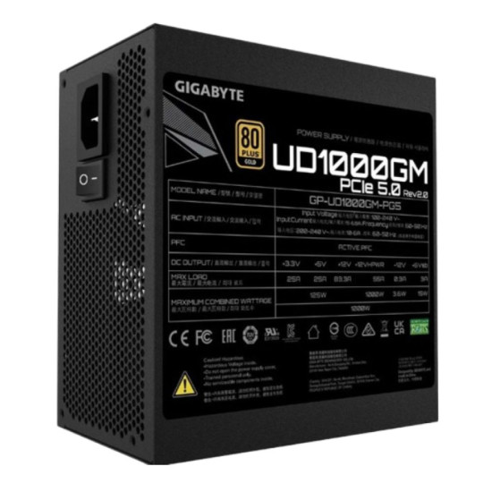 The Gigabyte UD1000GM PSU balances raw power and energy efficiency in a sleek, compact design. Whether you're building a next-gen gaming rig or upgrading a power-hungry workstation, this Gigabyte UD-GM PG5 model delivers clean, stable output with ultra-durable Japanese capacitors. Fully modular and ATX 3.0 certified, it's designed to meet the latest standards while offering reliable operation under load.