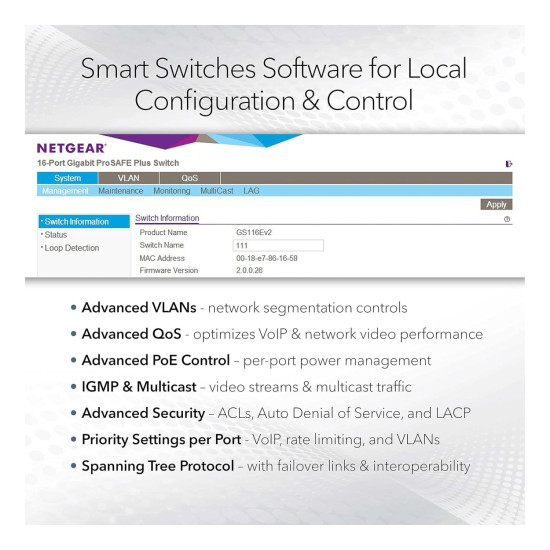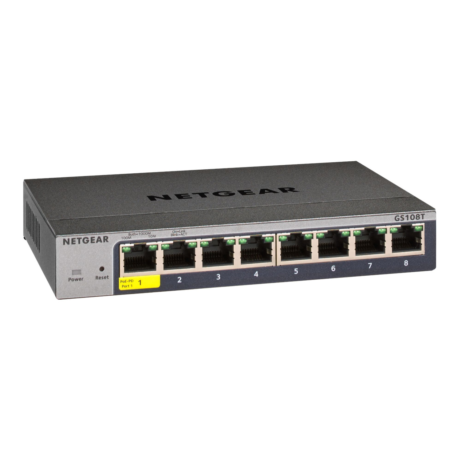 The GS108Tv3 8-port Gigabit Smart Switches provides a great value, with configurable L2 network features like VLANs and PoE operation scheduling, allowing SMB customers to deploy PoE-based VoIP phones and IP surveillance. Advanced features such as Layer 3 static routing, IPv6 management, ACL, DiffServ QoS, LACP link aggregation and Spanning Tree will satisfy even the most advanced small business networks.