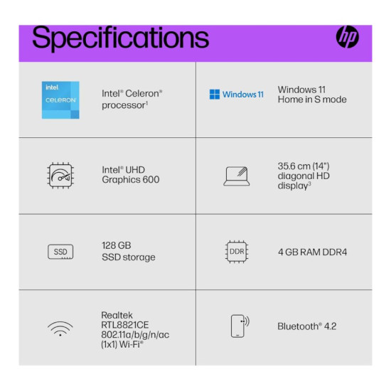 Lightweight, portable, and built to perform; the HP 14s-dq0034na is your ideal daily companion. Whether you're studying, working remotely, or streaming your favourite shows, this Intel Celeron N laptop delivers smooth performance, crisp visuals, and reliable connectivity in a sleek, compact chassis.
