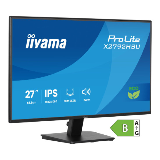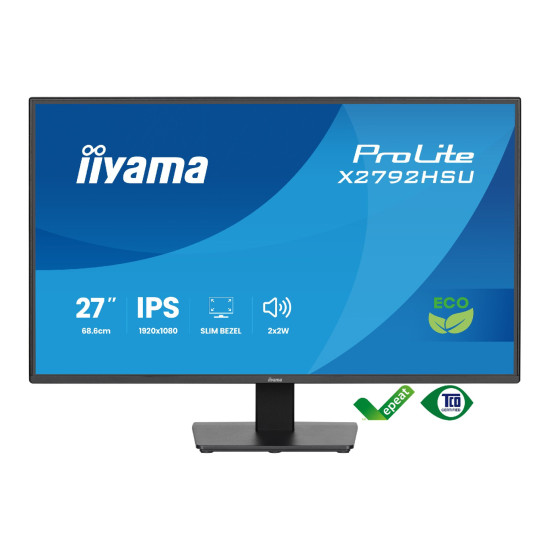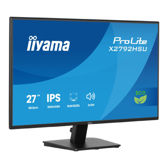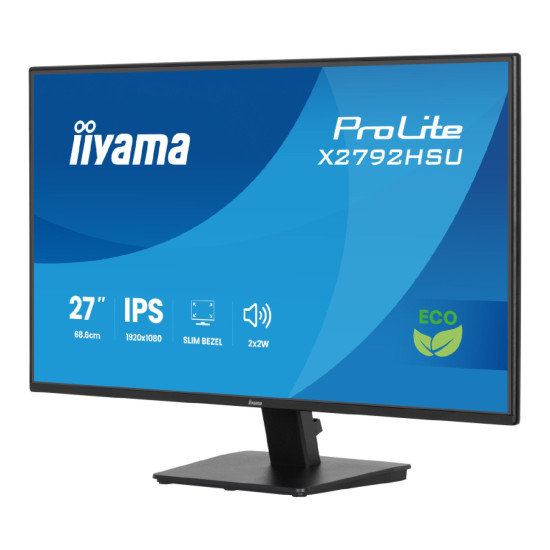 The ProLite X2792HSU is a 27'' Full HD monitor ideal for professionals who need more screen space, precise image quality, and a sustainable choice. Packaged without plastic and made from 85% post-consumer recycled materials, it meets TCO Certification and EPEAT® Silver standards. Its IPS panel delivers sharp detail, vibrant colours and wide viewing angles, while the frameless design creates a sleek, distractionfree workspace. To take care of your eye health, it complies with the Eye Safe and Eye Comfort Certifications.