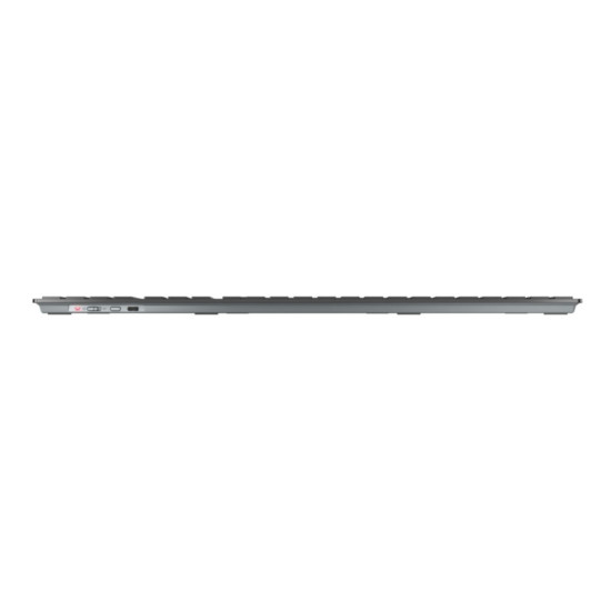 Should the battery need a charge, the USB-A to USB-C charging cable included with the slim wireless keyboard is quickly at hand. The status LEDs indicate the low battery status of the flat wireless keyboard by flashing at the right time. Those who like to work with a steeper angle while typing are recommended to use the removable magnetic strip, which can be mounted in seconds.