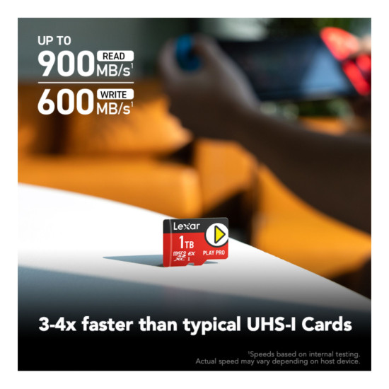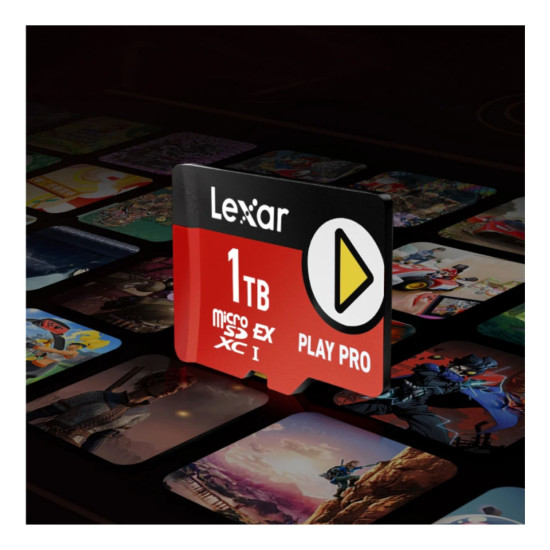 The Lexar PLAY PRO microSDXC™ Express Card gives gamers an epic performance power-up with up to 900MB/s read and 600MB/s write1 and capacity up to 1TB offers space for many AAA games.