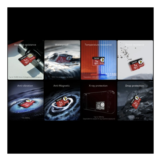 The PLAY PRO microSD Express card is IPX7 waterproof, wearproof, temperature-proof, x-ray-proof, vibration-resistant, magnetic-proof, shockproof, and drop-proof.