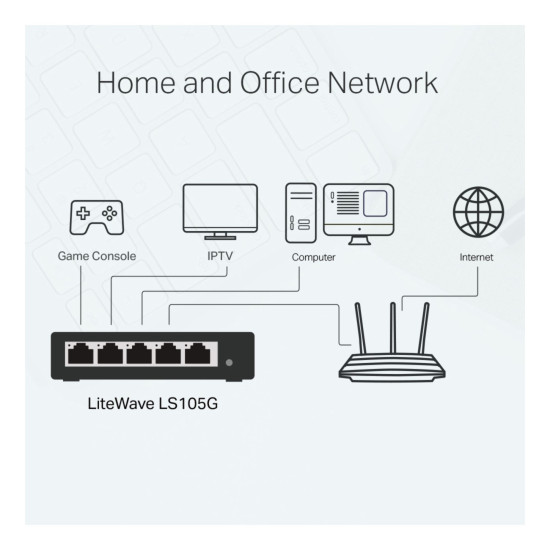 The LS105G is fully compatible with networked devices such as computers, printers, webcams, IPTVs. It has a wide range of application scenarios and is suitable for networking in school dormitories, surveillance, homes, and small businesses.