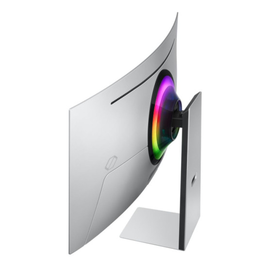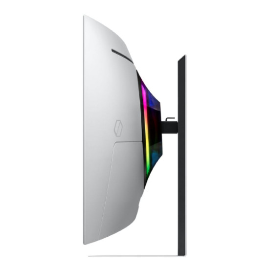The LS34DG850SUXXU Samsung G8 gaming monitor includes tilt, height, and pivot adjustments for ergonomic comfort. Its sleek silver metal finish with ultra-thin design adds sophistication to gaming and professional setups.