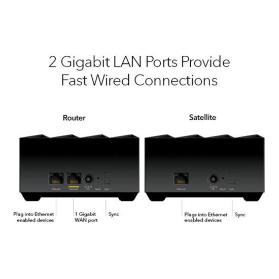 Wired ETHERNET PORTS - Connect your computers, game consoles, streaming players and other wired devices nearby with Gigabit Ethernet ports available on the router and satellites