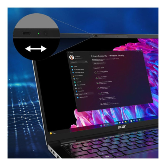 This laptop enhances conference calls with its dual upward speakers and a dual microphone array that picks up vocals from up to two meters away. AI-powered noisereduction technology also dramatically improves clarity by minimizing background noise for crystal-clear online voice communication, while the MIPI webcam offers brighter and clearer images even in low-light situations. When the webcam is not in use, feel free to close the camera shutter for some extra privacy.