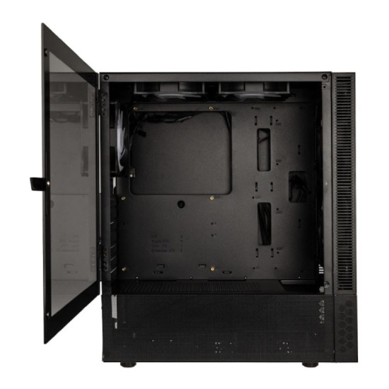 This is the Glass model in black. The front panel is manufactured from tempered glass, with subtle mesh side ventilation. To ensure this chassis has ample airflow, the dedicated PSU shroud is formed with mesh panelling. As the black model, the exterior, interior, and shroud are all black, with a two-tone material finish for a bold effect.