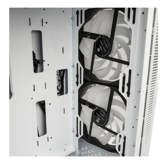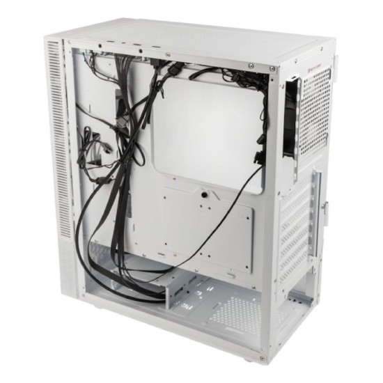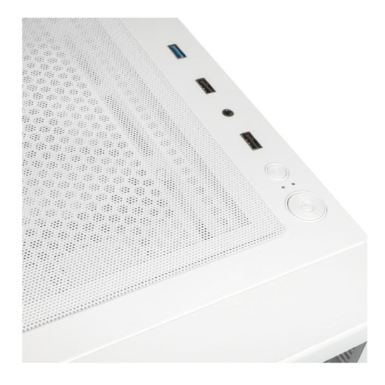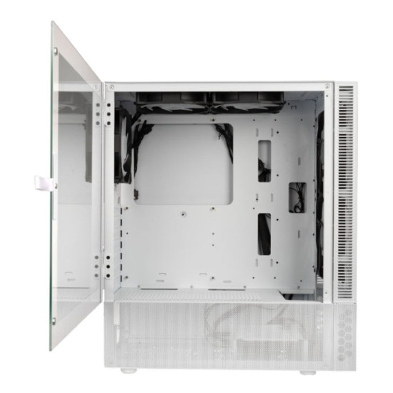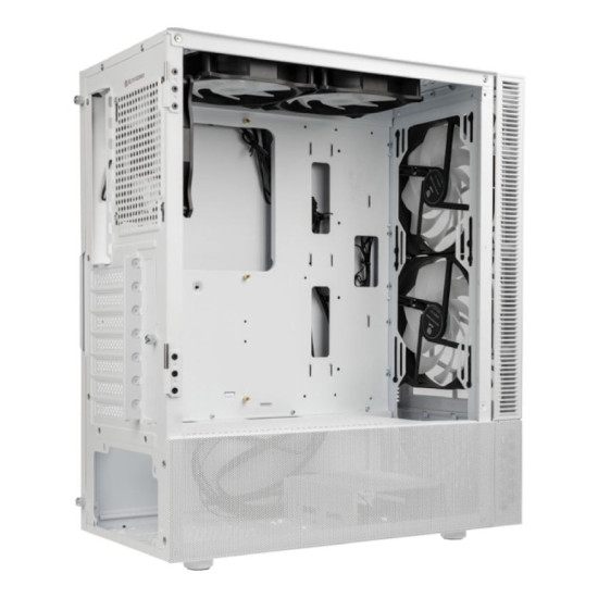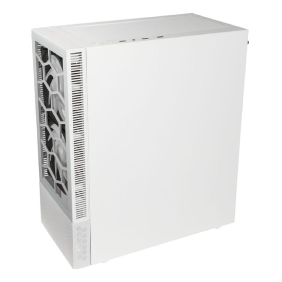 This is the Glass model in white. The front panel is manufactured from tempered glass, with subtle mesh side ventilation. To ensure this chassis has ample airflow, the dedicated PSU shroud is formed with mesh panelling. As the white model, the exterior, interior, and shroud are all white, with a two-tone material finish for a bold effect.