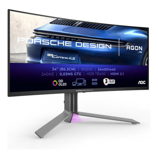 Elevate your performance with the Porsche Design 34-inch WQHD Curved OLED Monitor. Experience a 240Hz refresh rate and HDR TrueBlack 400 for unparalleled visual excellence!