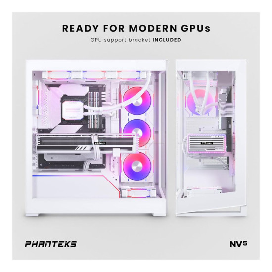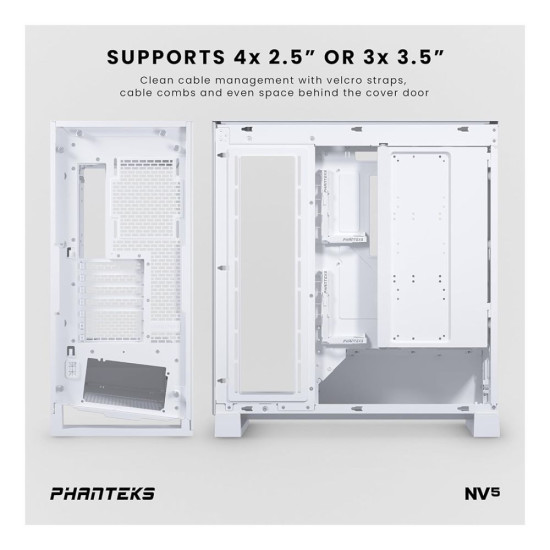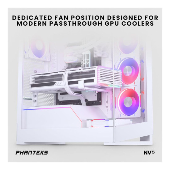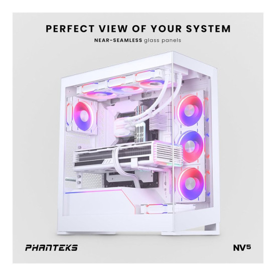 Meet the NV5 mid-tower chassis, featuring a stunning near-seamless glass view and support for 8 x 120 mm fans and dedicated space for a 360 radiator in the top and side for optimal cooling. With a dedicated bottom fan for enhanced GPU cooling and spacious interior to accommodate modern GPUs and cables, the NV5 is designed to excel.