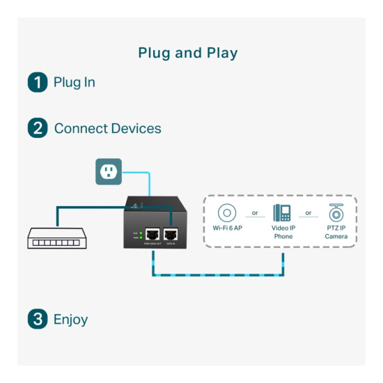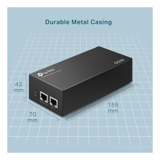 Power devices such as IP cameras, VoIP phones, and access points with the black TL-POE170S PoE++ Injector from TP-Link. This unit will support devices that require up to 60W of PoE. It complies with IEEE 802.3af/at/bt standards and supports 1000 Mb/s passthrough data rates. The TL-POE170S can be wall mounted or placed on a desktop for flexible installation.