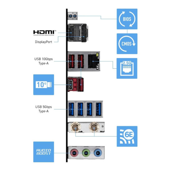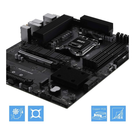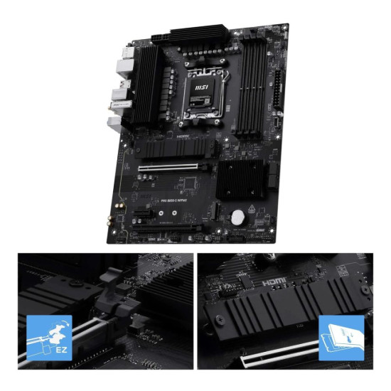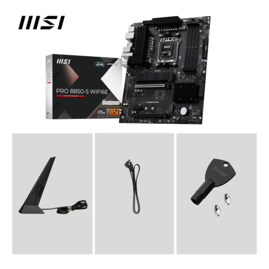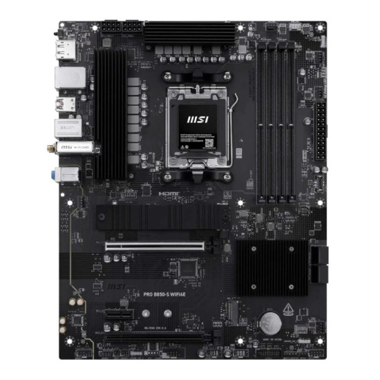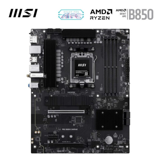 PRO B850-S WIFI6E offers a simple design with a harmonious color scheme that perfectly matches black PC builds.It is engineered with many exclusive features of MSI, a Wi-Fi 6E with EZ Antenna, 2.5G LAN, and PCIe 5.0 M.2 with M.2 Shield Frozr, ready for the AMD Ryzen™ 9000 series processors.
