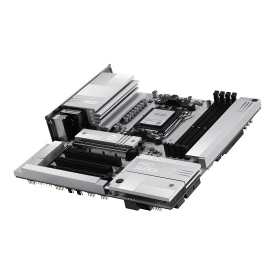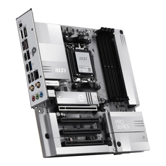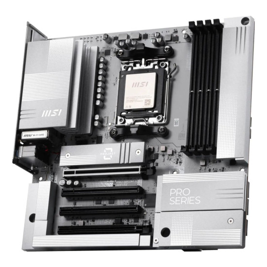 PRO B850M-A WIFI PZ offers a sleek design with a harmonious silver-white color scheme that perfectly matches white PC builds. Its innovative back-connect design reduces the complexity of cable management, resulting in an aesthetically pleasing appearance for the system. It is engineered with many exclusive features of MSI, Wi-Fi 7 with EZ Antenna, 5G LAN, PCIe 5.0 M.2, and Supplemental PCIe Power, ready for the AMD Ryzen™ 9000 series processors.