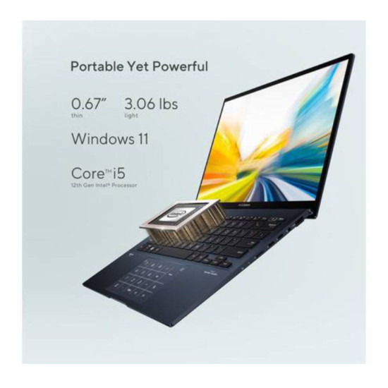 The powerful and compact Zenbook 14 is just 16.9 mm slim and 1.39 kg1 light, with a breathtaking new design that's timelessly elegant yet totally modern. You'll experience perfect visuals from the expansive 16:10 2.5K IPS NanoEdge display2, a color-accurate up to 400-nit screen that delivers 100% sRGB color gamut. The 12th Gen Intel Core i7 Processor, Intel Iris Xe graphics, 16 GB RAM and 1 TB PCIe 4.0 SSD deliver superb performance, and there's a long-lasting 75 Wh battery. For extraordinary sound, there's a Dolby Atmos sound system powered by a smart amplifier. The user-centric design includes one-touch login with a fingerprint sensor on the power button, the new ASUS ErgoSense keyboard, and the efficient ASUS NumberPad 2.0. The bold new lid design is inspired by timeless Kintsugi craftsmanship, and it's available in two fresh new colors: Ponder Blue and Aqua Celadon. Zenbook 14 is the new benchmark for portable perfection.