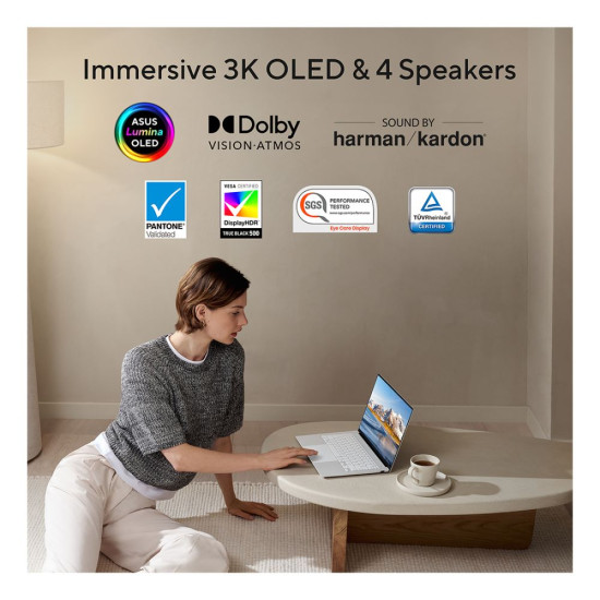 Immerse yourself in lifelike visuals with the stunning 3K OLED display, which delivers vibrant colours and incredible detail. Coupled with the four-speaker audio system, this laptop offers an unparalleled multimedia experience, whether you're watching movies or creating content.
